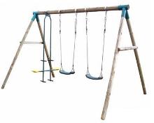 · Todos los palos que forman los columpios son en madera FSC de primera calidad. · Las cuerdas son en polyethylene de 10mm y muy suaves. · 2 sillas, 1 columpio frente a frente · 12 años de garantía contra daños creados por los insectos y la decomposicion de la madera. · Herramienta para el montaje incluida y tambien las anclas metalicas para fijar el columpio en el suelo. · Recomendados para niños de 3-12 años. · Dejar un perimetro de seguridad de 1.8m. · Dimensiones: ancho x profundo x alto 3m x 2,2m x 2,3m · Aprobado CE |